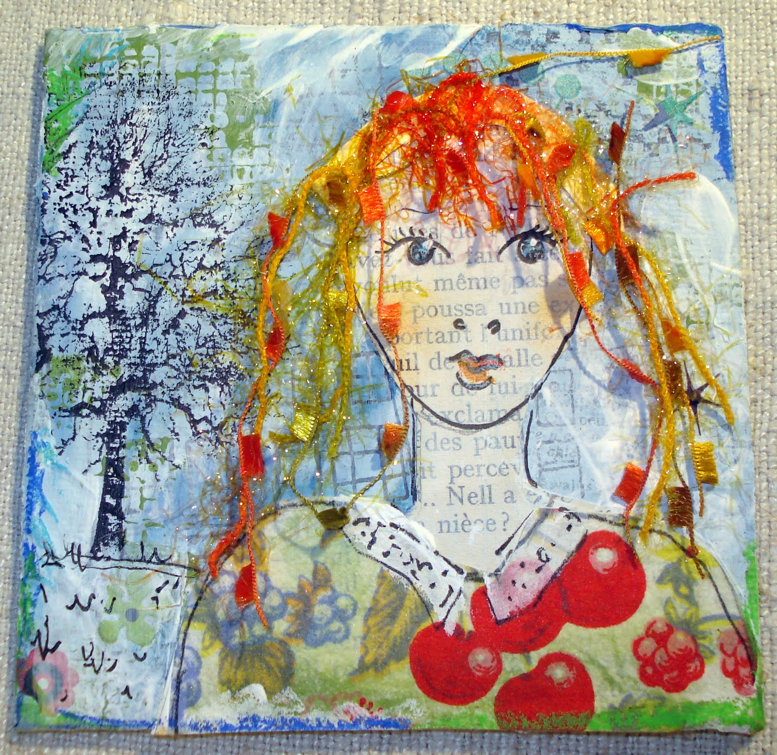 Maintenant celle-ci est inspirée d'un vidéo de .... J'ai fait ce petit canevas 4x4 sans trop d'assurance. Toutefois Je suis bien contente du résultat cette-fois-ci. J'aime bien mon idée d'avoir ajouté des cheveux en fil "fous". La robe est faite de coupures d'une de mes nappes en papier favorite. Elle est faite de papier lavable (!?). Le fond est une superposition de peinture, de gesso, d'étampes, de pastels et de motifs autocollants (rub-ons).